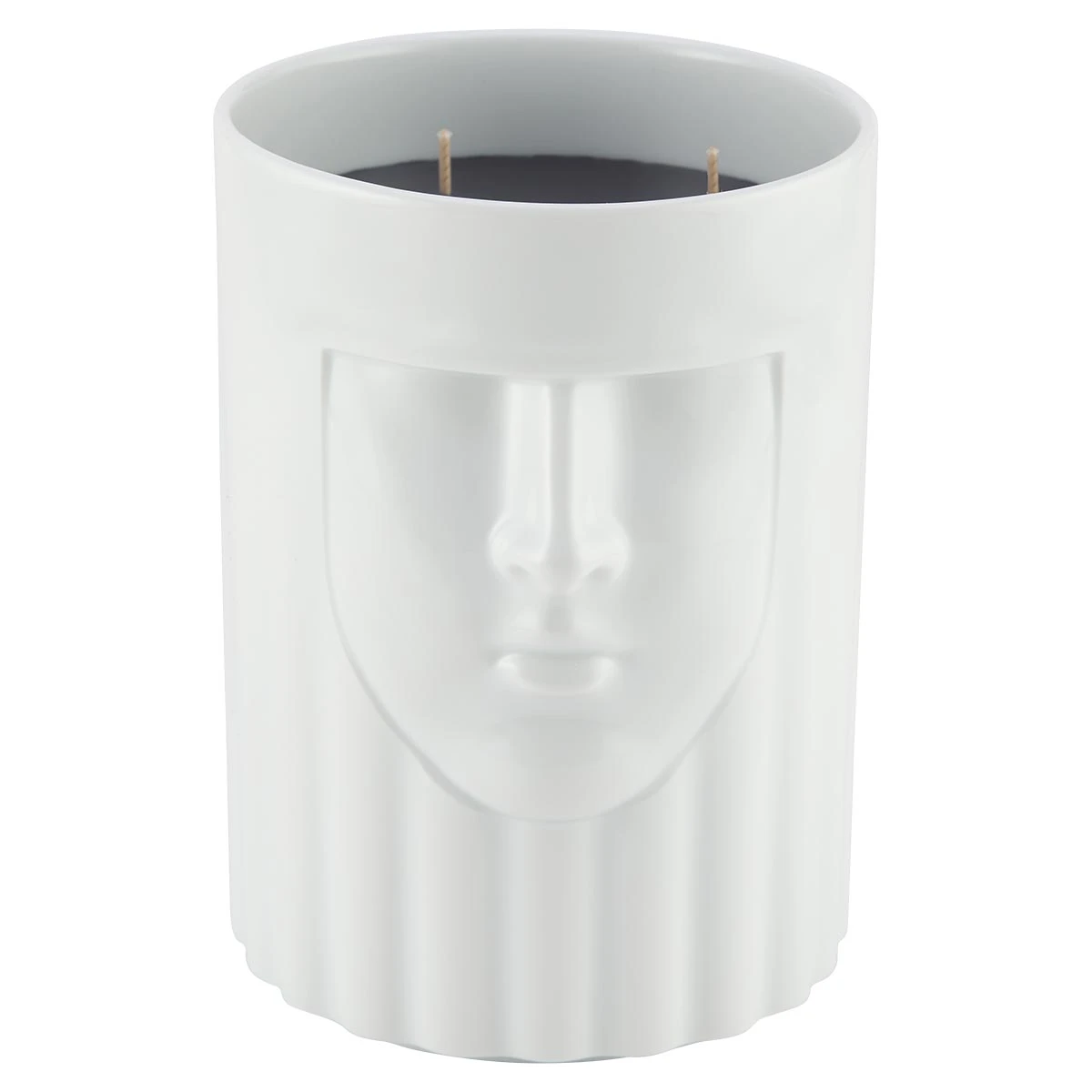 A candle made from wax melted inside a cylindrical sculpture in white porcelain whose lines depict a feminine face with an ethereal elegance.