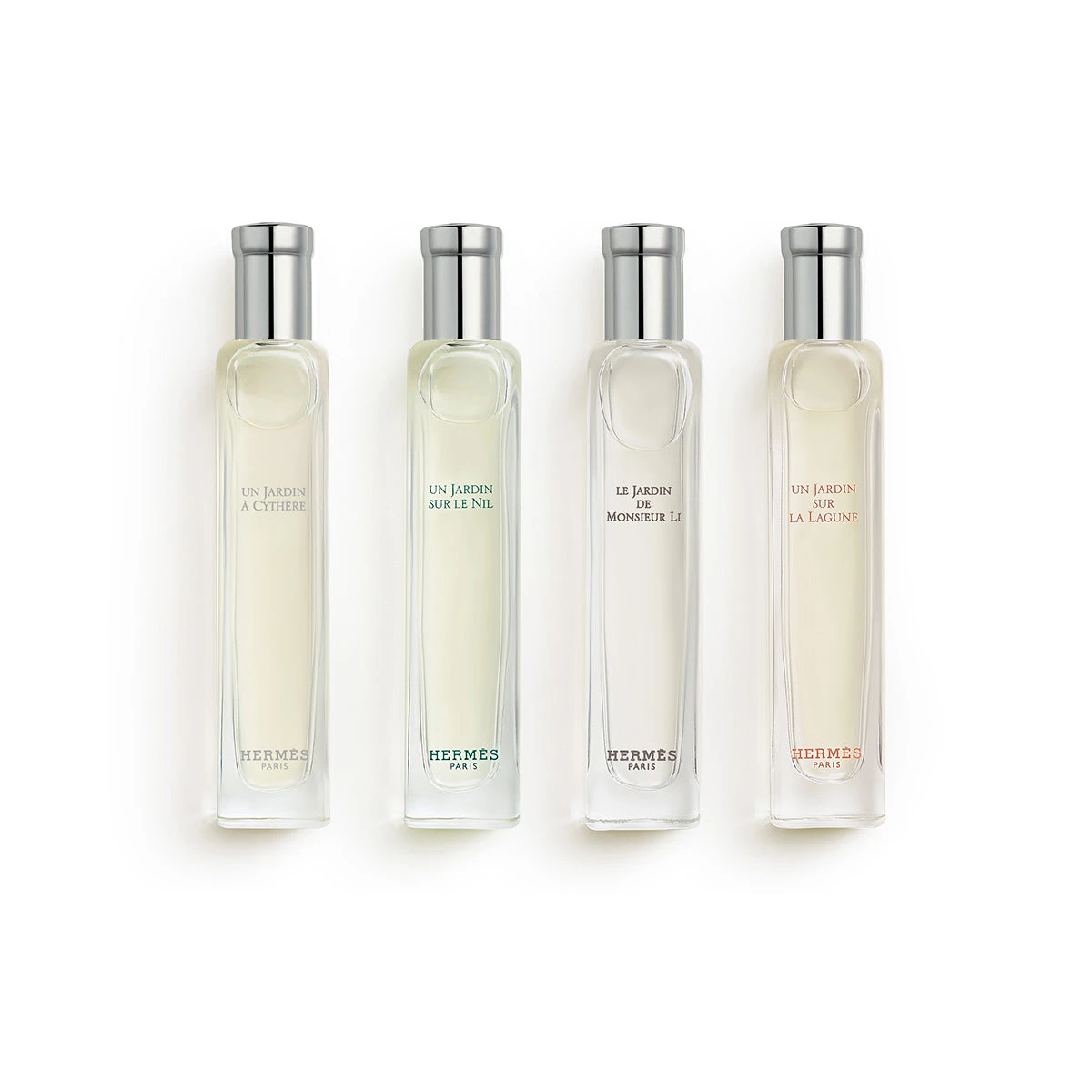 Discover four iconic Hermès Parfums-Jardins fragrances. Nestled in their orange box, four travel size 15 ml bottles invite you on an olfactory escape.
