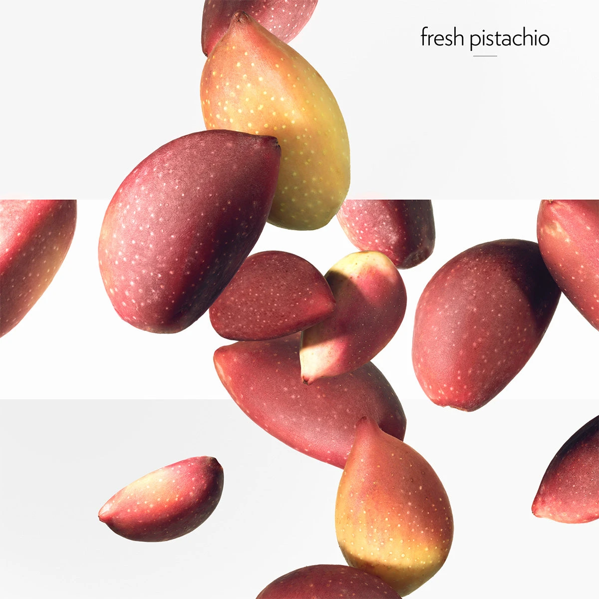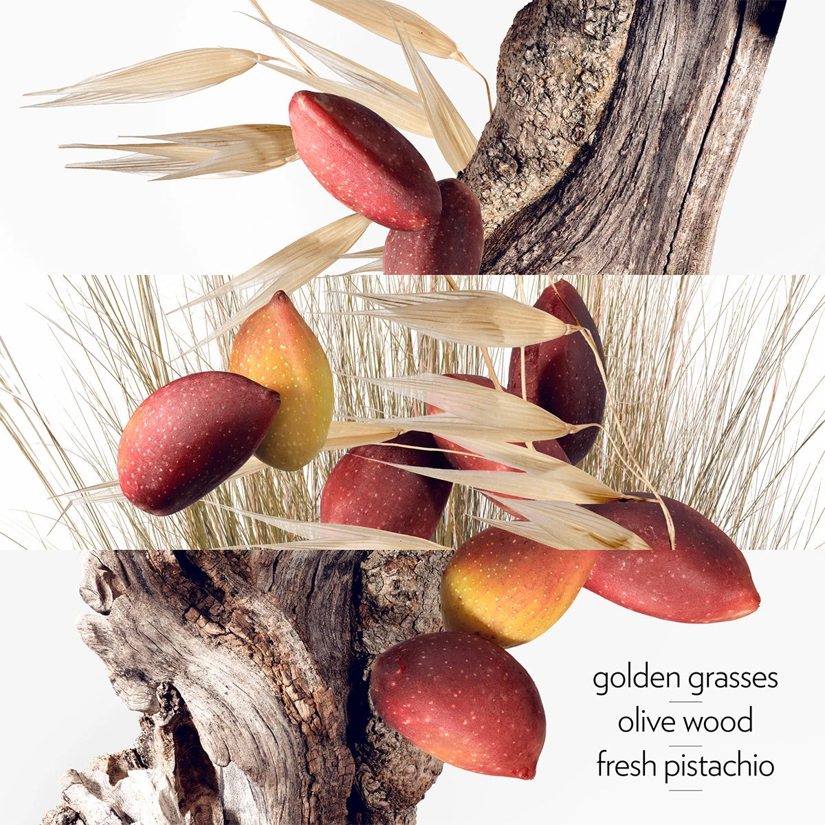 Designed by Fred Rawyler, the bottle is inspired by the lines of the horse-drawn carriage lanterns of yesteryear. The luminous yellow glass echoes the sunny fragrance. On the box, artist Elias Kafouros sketches a colorful landscape of his homeland: golden grasses, green olive trees, fresh pink pistachios and in the background, the blue of the sea.