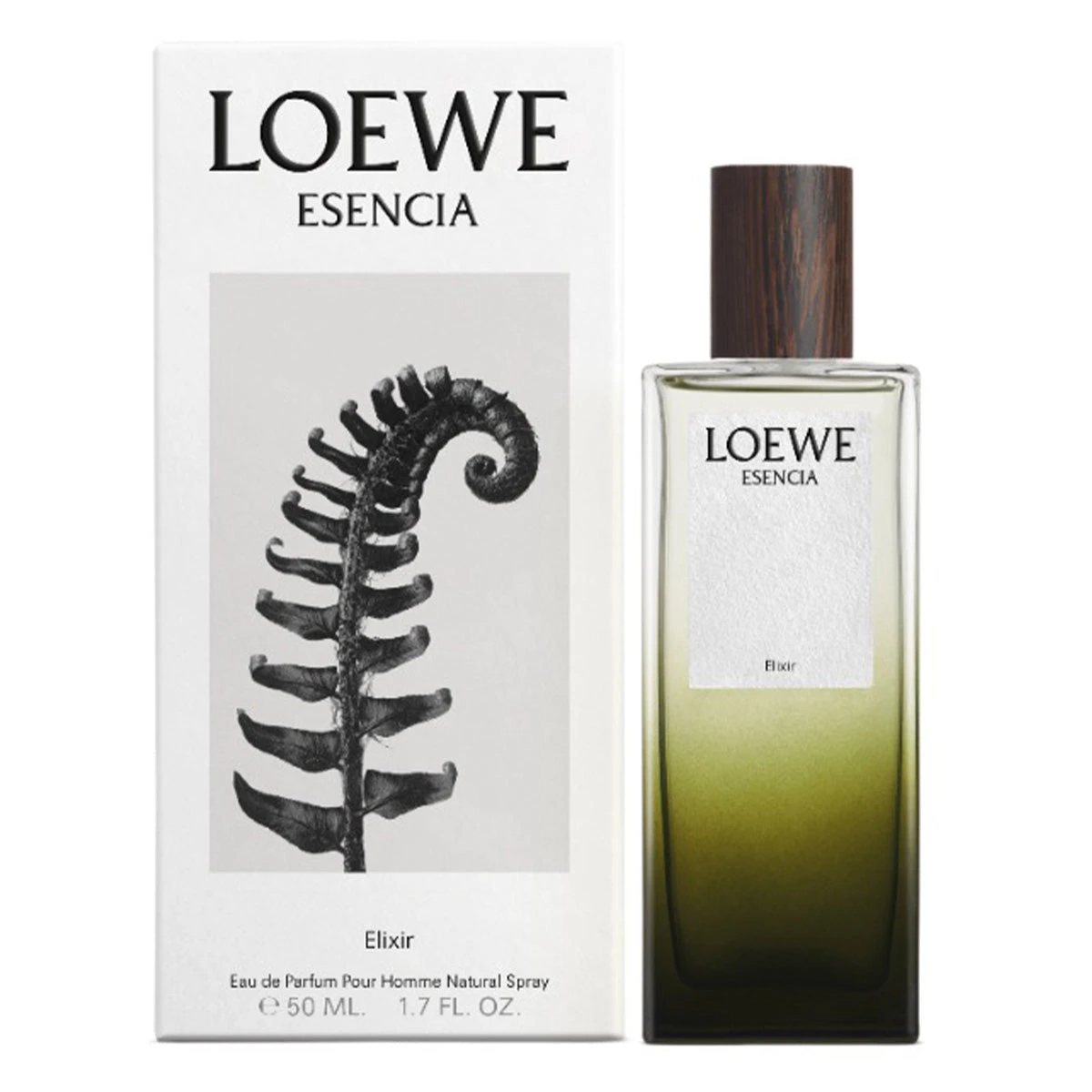 LOEWE Esencia Elixir EDP comes encapsulated in a glass flask in a gradient of green, echoing the bottle of its original iteration, and finished with a wooden cap.