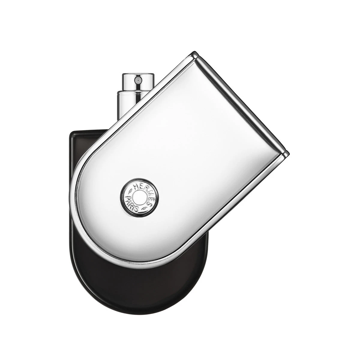Designer Philippe Mouquet created a unique object inspired by a pocket magnifying glass found by chance. The black glass bottle is encased in a silver-coloured stirrup and decorated with the emblematic saddle nail.